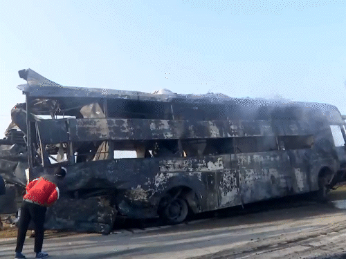 ये मथुरा में यमुना एक्सप्रेस-वे की हैं, जहां धुंध-कोहरे के कारण पर 8 बसें और 3 कारें टकरा गईं। गाड़ियों में आग लगने से 13 लोगों की जलकर मौत हो गई और 70 घायल हुए।