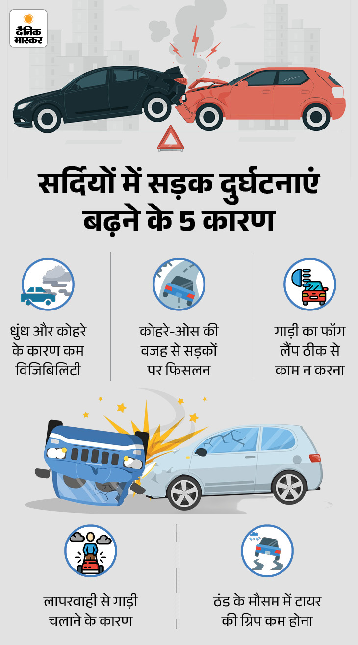 जवाब- मुख्य वजह घना कोहरा और धुंध है। इससे नजर बहुत कम हो जाती है, ड्राइवर को आगे का वाहन भी ठीक से दिखाई नहीं देता। खासकर उत्तर भारत में दिसंबर-जनवरी में कोहरा इतना घना होता है कि विजिबिलिटी जीरो तक पहुंच जाती है। ऐसे में हादसे आम हो जाते हैं।