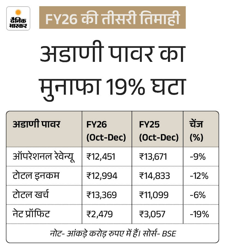 अडाणी ग्रुप की कंपनी अडाणी पावर लिमिटेड को वित्त वर्ष 2025-26 की तीसरी तिमाही में ₹2,479 करोड़ का मुनाफा (कॉन्सोलिडेटेड नेट प्रॉफिट) हुआ है। सालाना आधार पर यह 19% कम हुआ है। पिछले साल की समान तिमाही में कंपनी को ₹3,057 करोड़ का प्रॉफिट हुआ था।