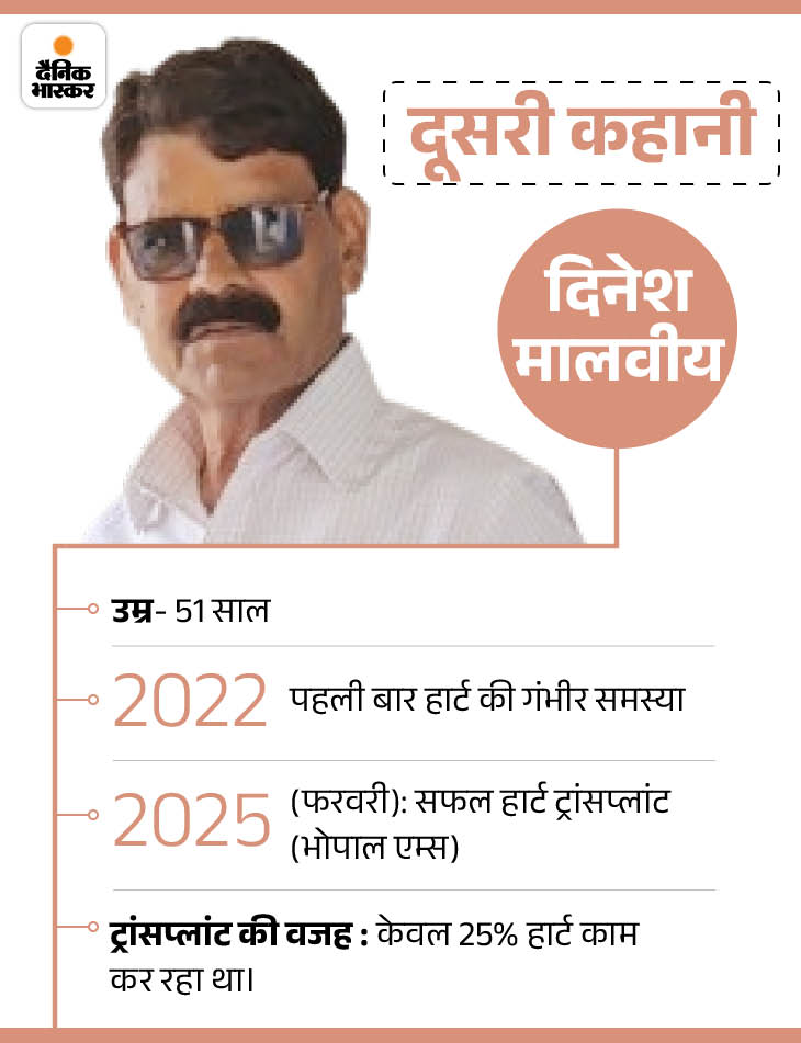 ऐसी एक और कहानी है 51 साल के मंडी व्यापारी दिनेश मालवीय की। इटारसी के रहने वाले मालवीय के सीने में 7 महीने पहले भोपाल एम्स में एक नया दिल धड़का है। वे धीरे-धीरे अपनी पुरानी जिंदगी में लौट रहे हैं। ये दो अलग-अलग कहानियां हैं, लेकिन इनमें कॉमन बात है कि दोनों के शरीर में दूसरों का दिल धड़क रहा है।