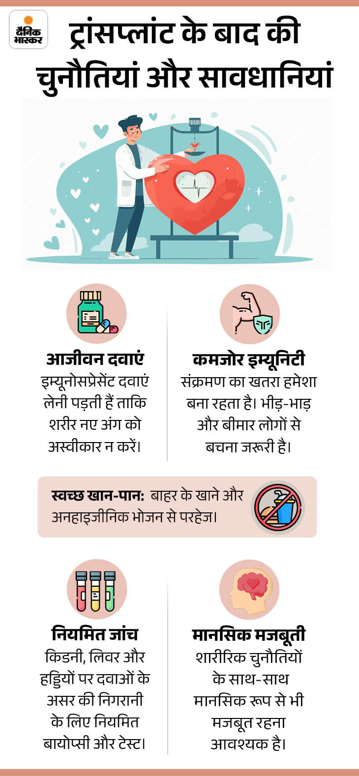सावधानी भरी नई दिनचर्या दिनेश की जिंदगी अब बहुत सावधानी से आगे बढ़ रही है। हमारी बातचीत के दौरान जब उनकी कंप्यूटर ऑपरेटर छींकते हुए ऑफिस आईं, तो उन्होंने तुरंत उसे घर जाकर आराम करने और पूरी तरह ठीक होकर आने को कहा। वे बताते हैं, ‘डॉक्टरों ने ऐसी दवाइयां दी हैं जिनसे रोग प्रतिरोधक क्षमता कम रहती है, ताकि शरीर नए हार्ट को रिजेक्ट न करे। इस वजह से छोटे से छोटा संक्रमण भी खतरनाक हो सकता है।’
