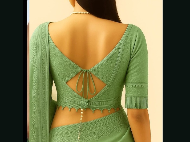 हल्के हरे रंग की इस ब्लाउज़ में पीछे कट-आउट और डबल टाई डिज़ाइन किया गया है. इस डिज़ाइन में ब्लाउज़ का बैक स्ट्रक्चर स्लीक और एलिगेंट है, जिससे साड़ी का लुक क्लासिक और ग्रेसफुल दिखाई देता है. छोटे-छोटे पर्ल या बीड्स के डिटेल इसे और भी प्रीमियम टच देते हैं. ( pinterest)