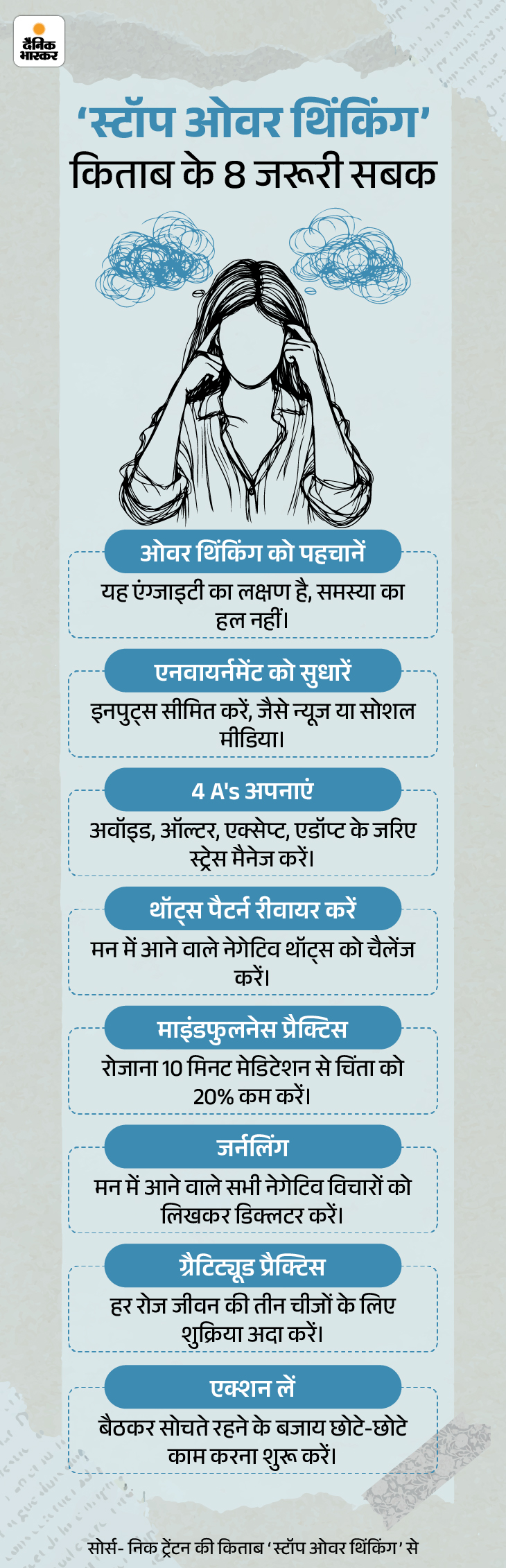 अमेरिकी लेखक निक ट्रेंटन की किताब ‘हाउ टू स्टॉप ओवर थिंकिंग’ माइंड को डिक्लटर करने और प्रेजेंट पर फोकस करने पर बेस्ड है। ये हमें ज्यादा सोचने की आदत से मुक्ति दिलाने की प्रेरणा देती है।
