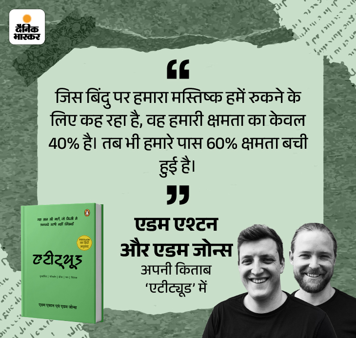 जब आपको लगे कि आपके काम करने की सीमा खत्म हो गई है, तो असल में उस समय आप सिर्फ 40% थके होते हैं। थकान के बाद भी खुद को थोड़ा और पुश करें। ये अमेरिकन नेवी सील का कॉन्सेप्ट है। थकने के बाद भी खुद को एक बार पुश करिए। उस समय भी आपके भीतर बहुत ऊर्जा बची होती है।
