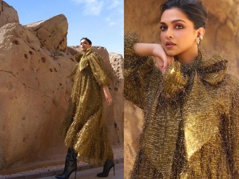 दीपिका पादुकोण ने गोल्ड टेक्सचर्ड काउचर आउटफिट में बो ट्रेंड को ग्लैमरस टच दिया. हाई नेक डिजाइन और मेटैलिक फैब्रिक के साथ लगा बो उनके लुक को सॉफ्ट बनाता है. सिंपल हेयरस्टाइल और कम एक्सेसरीज़ ने आउटफिट की बनावट को हाईलाइट किया है. <br /><br />