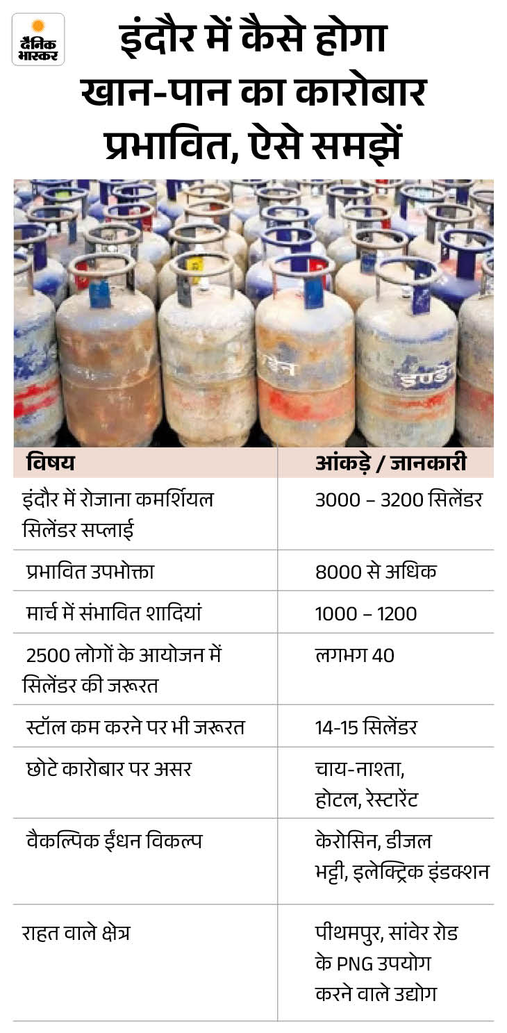 इंदौर के खानपान कारोबारियों का कहना है कि अगर जल्दी सप्लाई शुरू नहीं हुई तो चाय-पोहे की छोटी दुकानों से लेकर रेस्टारेंट तक एक-दो दिन में बंद होने लगेंगे। दूसरी ओर मार्च में शादियों का सीजन शुरू होने से मैरिज गार्डन और होटलों में करीब 1000 से 1200 शादियां तय हैं, जिन पर भी इसका असर पड़ सकता है।