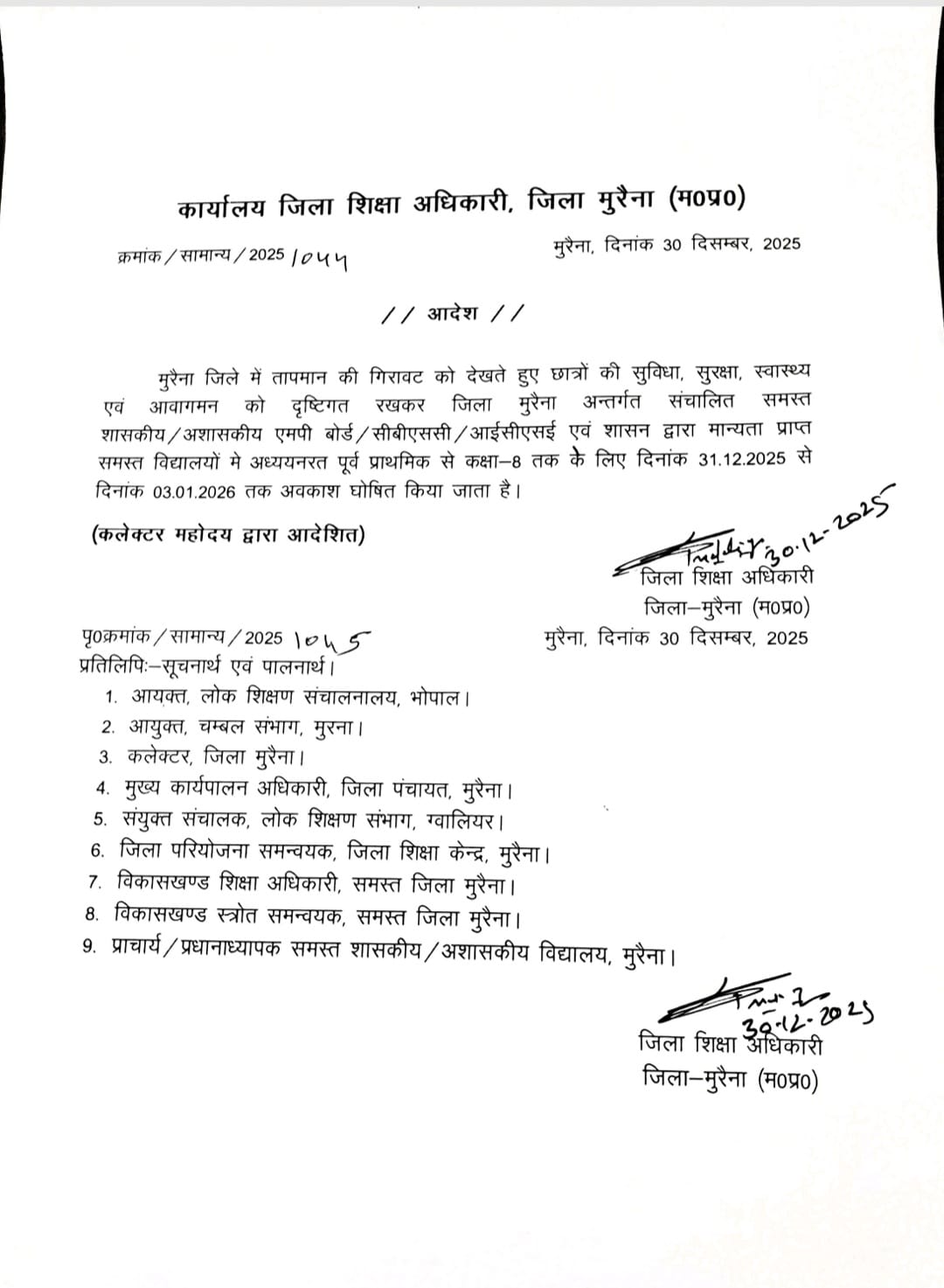 मुरैना में कड़ाके की ठंड और घने कोहरे को देखते हुए जिला प्रशासन ने स्कूलों में छुट्टी घोषित कर दी है। जिले के सभी सरकारी और प्राइवेट स्कूलों में कक्षा 1 से 8वीं तक के बच्चों की 3 जनवरी तक छुट्टी रहेगी। यह आदेश छात्र-छात्राओं के स्वास्थ्य और सुरक्षा को