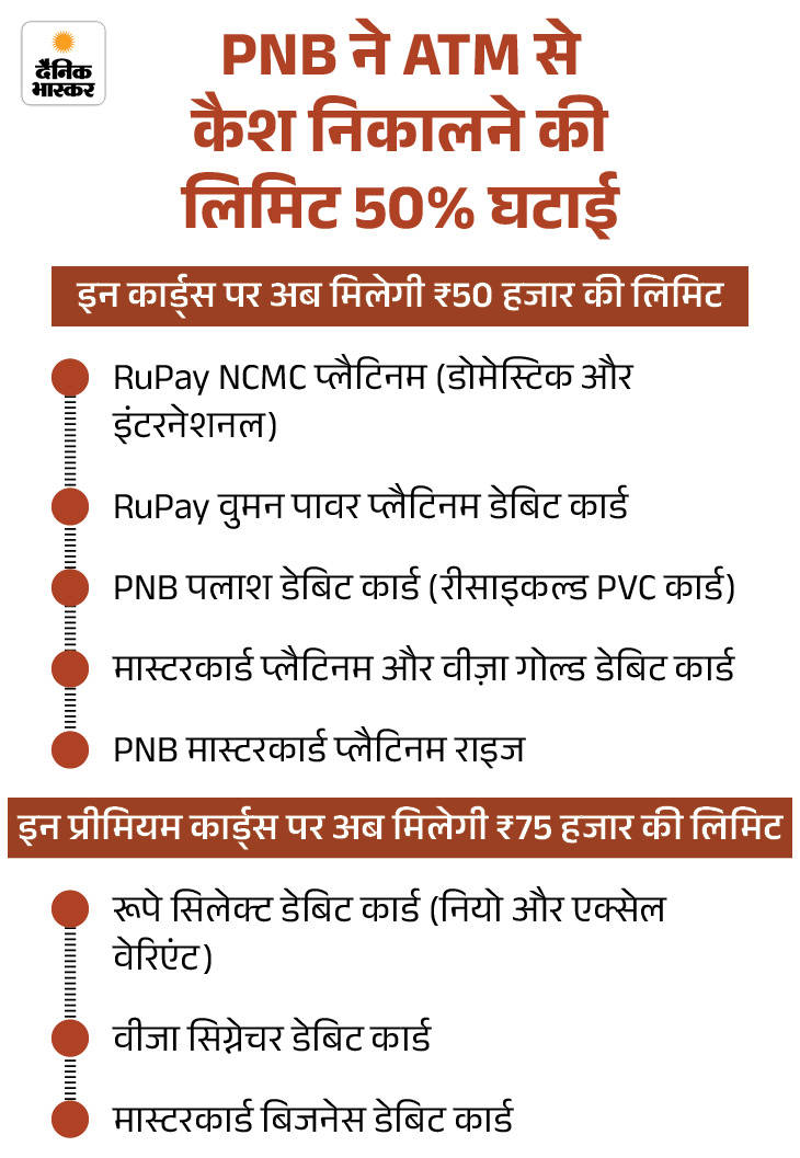 - बदलाव: पंजाब नेशनल बैंक के क्लासिक डेबिट कार्ड से एक दिन में अधिकतम ₹25 हजार निकाल सकेंगे। प्लैटिनम कार्ड के लिए यह लिमिट ₹50 हजार होगी।