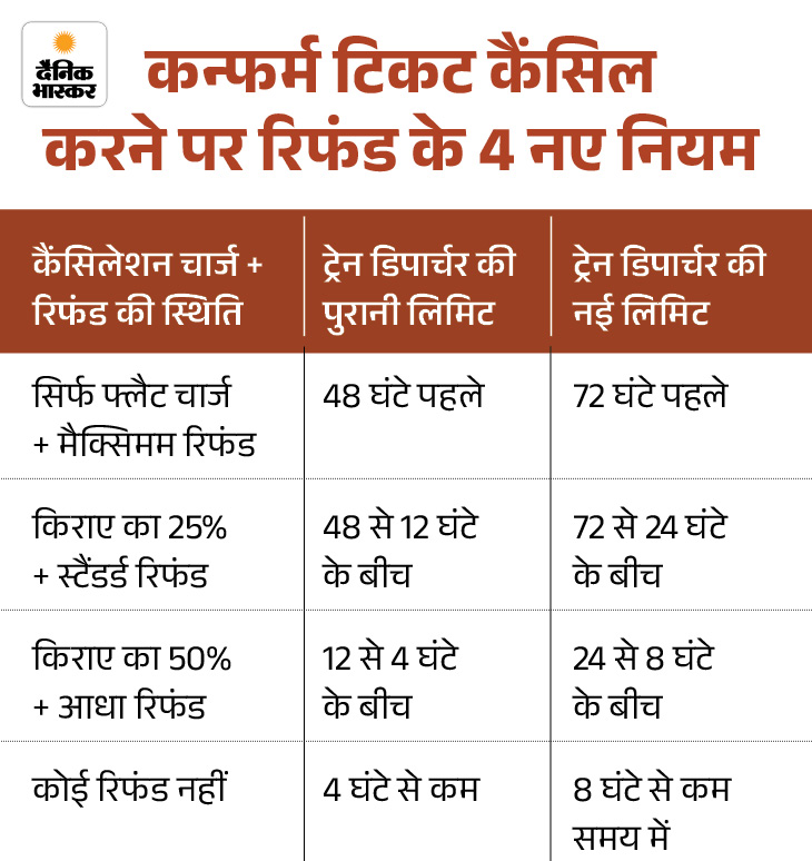 - बदलाव: ट्रेन छूटने से 8 घंटे पहले तक टिकट रद्द करने पर ही रिफंड मिलेगा। पहले यह समय 4 घंटे था। यात्री ट्रेन छूटने से 30 मिनट पहले तक बोर्डिंग स्टेशन भी बदल पाएंगे।