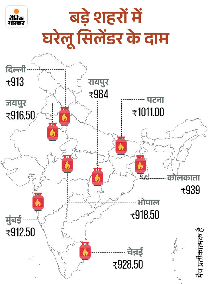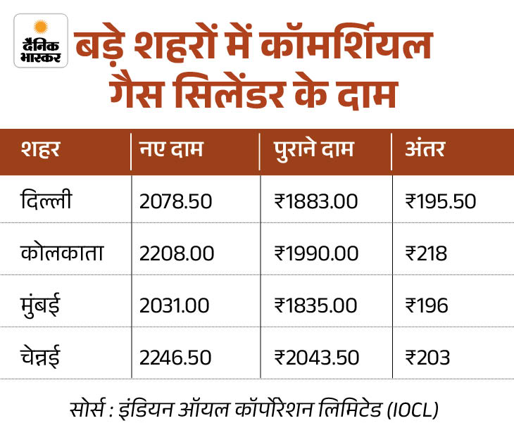 - बदलाव: तेल कंपनियों ने कॉमर्शियल गैस सिलेंडर ₹218 तक महंगा कर दिया है। चेन्नई में ये सबसे महंगा 2246.50 रुपए में मिलेगा। दिल्ली में इसकी कीमत ₹2078.50 हो गई है।