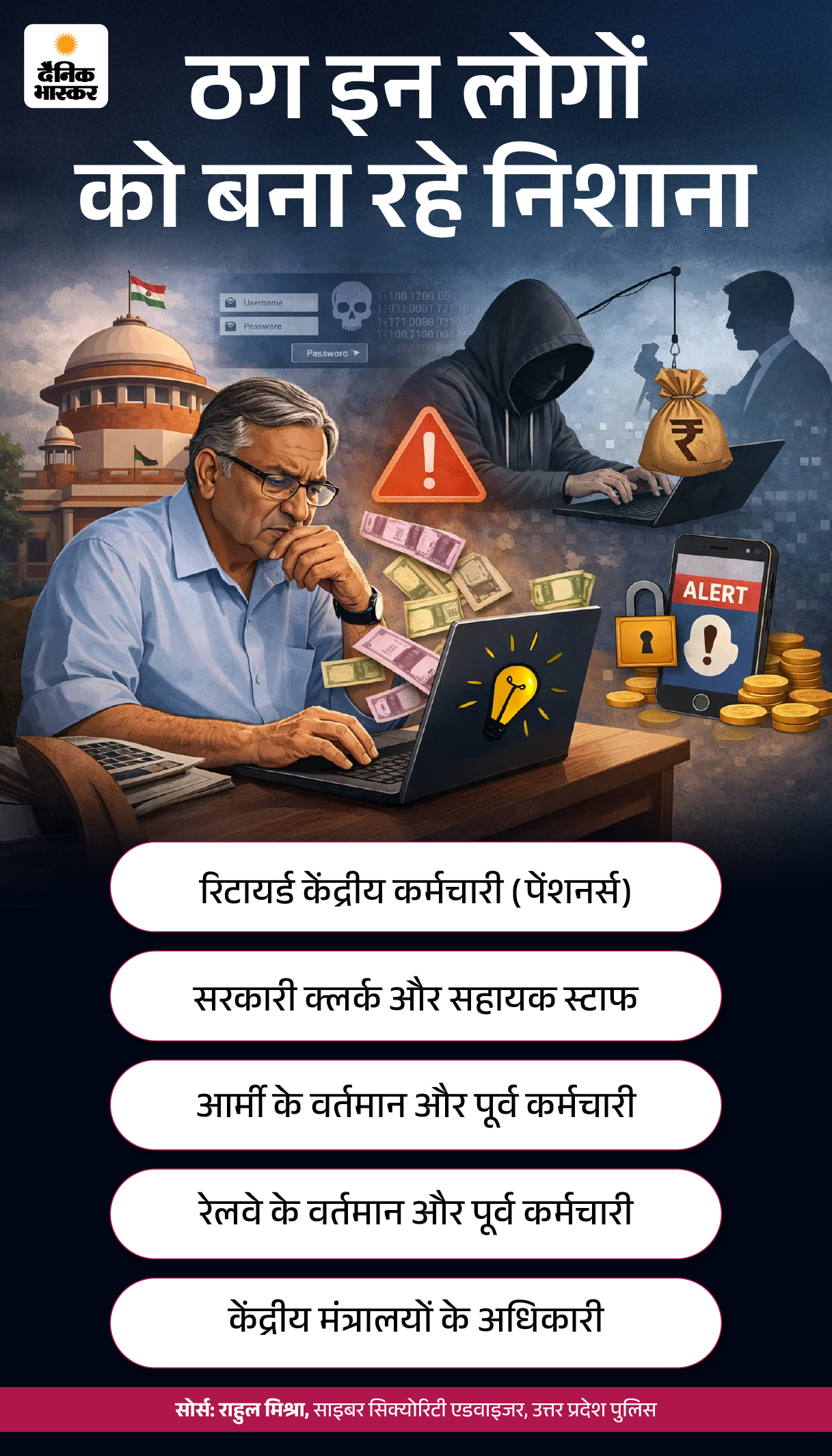 जवाब- ठग इसमें खासतौर पर केंद्रीय कर्मचारी टारगेट कर रहे हैं। साथ ही पेंशनर्स भी ठगों के निशाने पर हैं। पूरी लिस्ट ग्राफिक में देखिए-