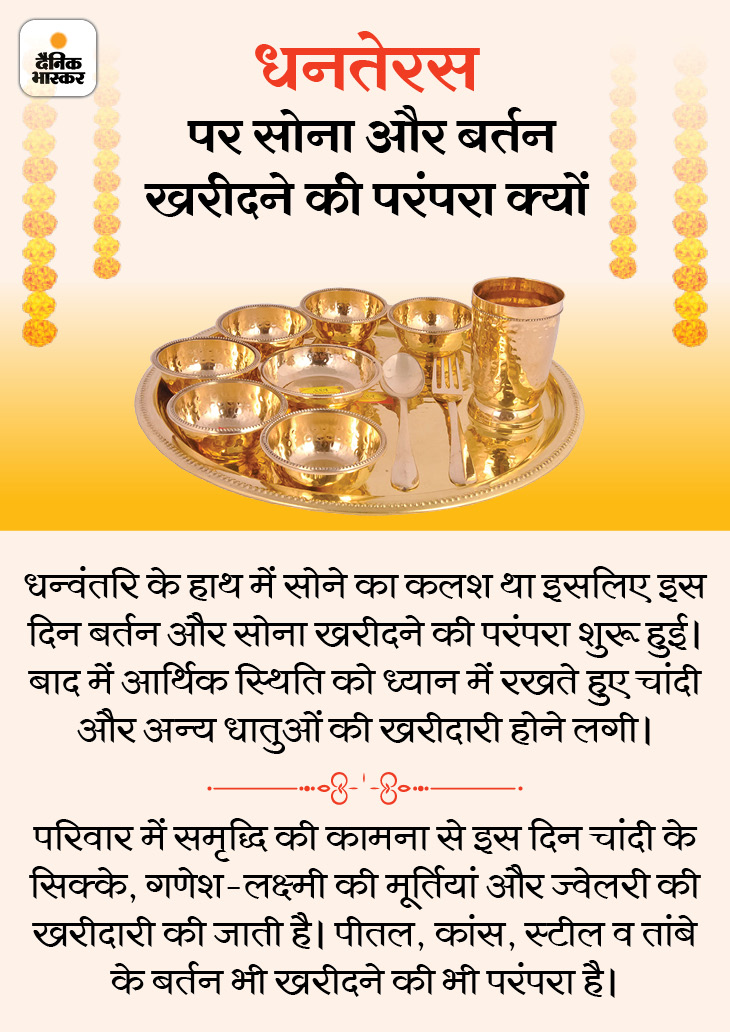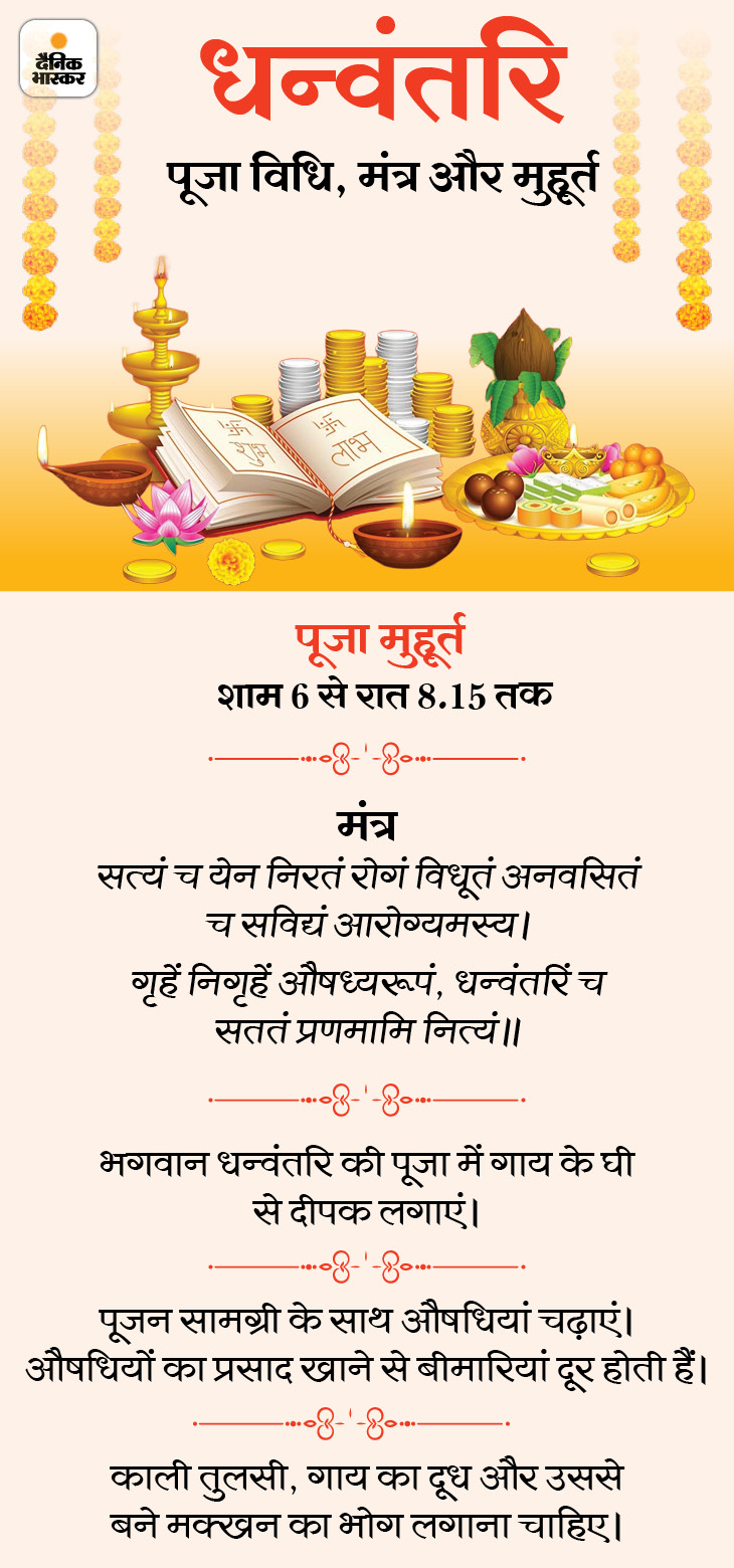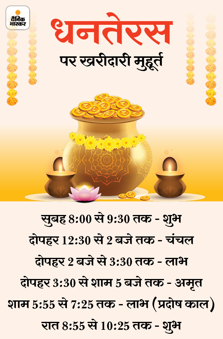 धनतेरस आज, खरीदारी के लिए रहेंगे 6 मुहूर्त: सोना और बर्तन खरीदने की परंपरा क्यों बनी, जानिए धन्वंतरि पूजन और यम दीपक लगाने की विधि