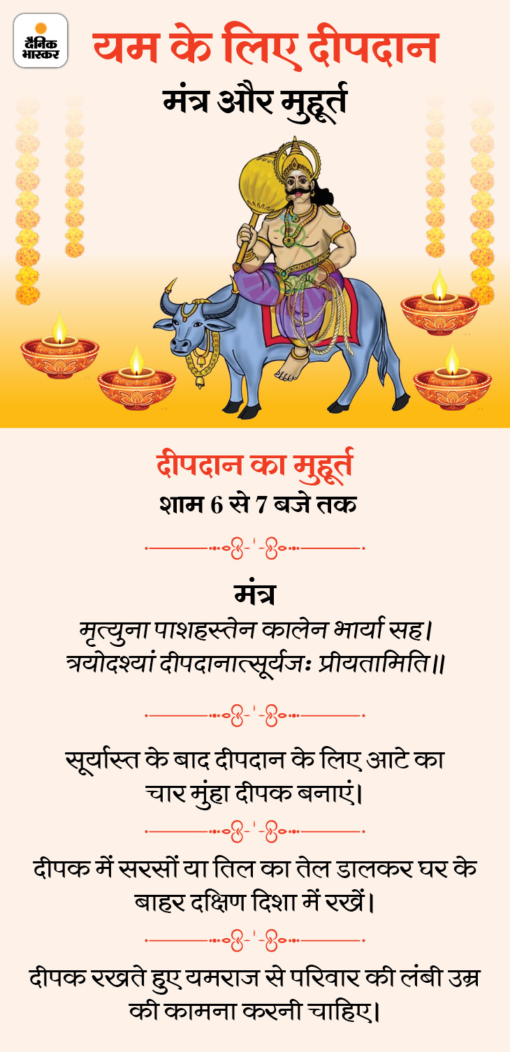आज धनतेरस से दीपोत्सव पर्व शुरू हो रहा है। दिनभर खरीदारी होगी। खरीदारी के लिए 6 मुहूर्त रहेंगे। शाम को आयुर्वेद के देवता धन्वंतरि के साथ कुबेर और लक्ष्मी जी की पूजा होगी। इसके बाद यमराज के लिए घर के बाहर दक्षिण दिशा में दीपक लगाया जाएगा। स्कंद पुराण के मुताबिक, इस दिन यमराज के लिए दीपदान करने से अकाल मृत्यु नहीं होती।