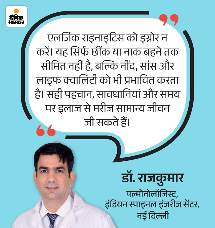 जवाब- पल्मोनोलॉजिस्ट डॉ. राजकुमार बताते हैं कि एलर्जिक राइनाइटिस वाले मरीज सबसे पहले यह पहचानें कि उन्हें किस चीज से एलर्जी हो रही है। जब कारण साफ हो जाता है तो बचाव और इलाज दोनों ही आसान हो जाता है। उदाहरण के लिए अगर धूल से एलर्जी है तो घर की साफ-सफाई पर ध्यान दें और बाहर जाते समय मास्क लगाएं। अगर लक्षण लगातार बने रहें तो डॉक्टर की सलाह से एंटीहिस्टामिन या नेजल स्प्रे का इस्तेमाल किया जा सकता है।