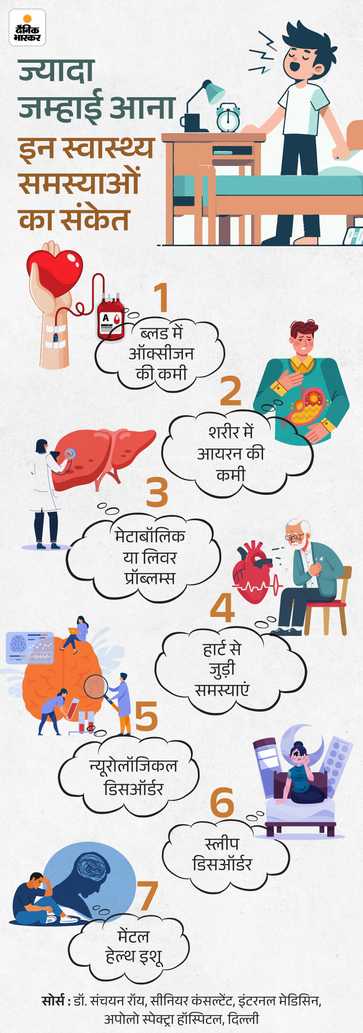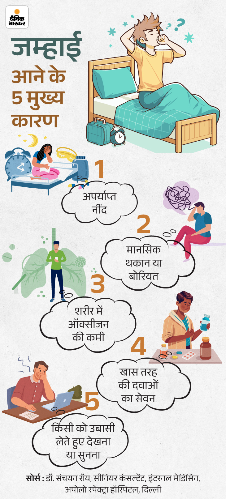 जवाब- भले ही जम्हाई आने के सबसे आम कारण थकान, सुस्ती या बोरियत हों। लेकिन यह कुछ अंदरूनी समस्याओं से भी जुड़ी हो सकती है। इसे नीचे दिए ग्राफिक से समझिए-