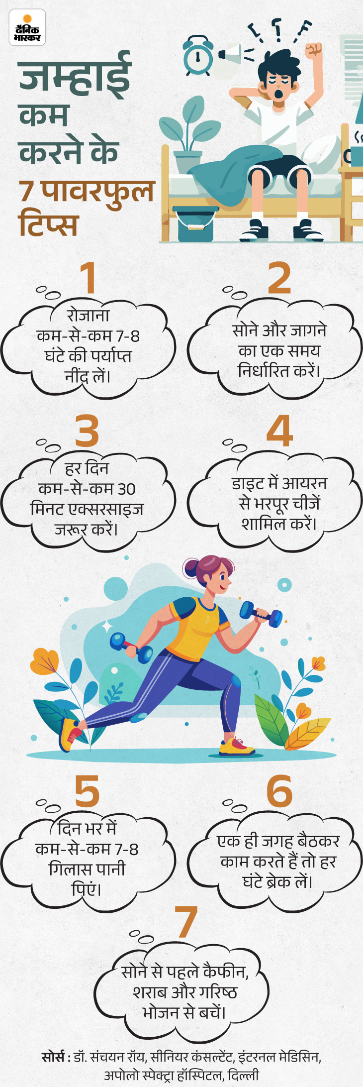 जवाब- अगर बिना किसी खास कारण के बहुत ज्यादा जम्हाई आती है तो कुछ आसान उपायों से इसे कम कर सकते हैं। इसे नीचे दिए ग्राफिक से समझिए-