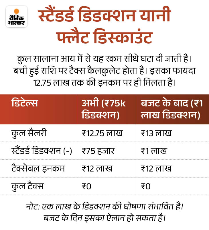 इनकम टैक्स की नई रिजीम में स्टैंडर्ड डिडक्शन 75 हजार से बढ़ाकर 1 लाख रुपए किया जा सकता है। इससे सैलरीड लोगों की 13 लाख रुपए की इनकम टैक्स-फ्री हो जाएगी। अभी 12.75 लाख रुपए तक कि इनकम टैक्स फ्री है।
