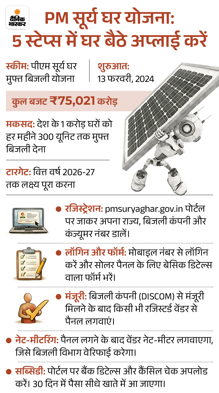 • केंद्र सरकार का लक्ष्य मार्च 2026 तक 40 लाख और 2027 तक 1 करोड़ घरों को सोलर ग्रिड से जोड़ना है। इस योजना से सरकार को अपना लक्ष्य तेजी से हासिल करने में मदद मिलेगी। दिसंबर 2025 तक 19.45 लाख से ज्यादा पैनल लग चुके हैं।