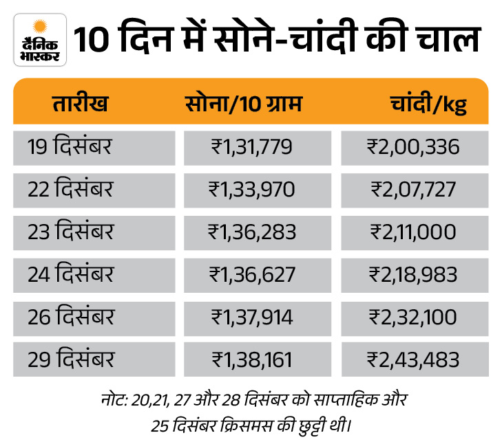 सोने-चांदी के दाम आज यानी 29 दिसंबर को लगातार पांचवें कारोबारी दिन ऑलटाइम हाई पर हैं। इंडिया बुलियन एंड ज्वेलर्स एसोसिएशन (IBJA) के अनुसार, 1 किलो चांदी की कीमत 205 रुपए बढ़कर 1,38,161 पर पहुंच गई। इससे पहले ये 1,37,956 रुपए प्रति 10 ग्राम पर है।