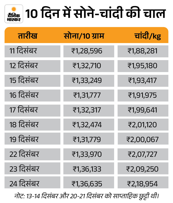 वहीं, 1 किलो चांदी की कीमत 7,934 रुपए बढ़कर 2,18,954 रुपए प्रति किलो के ऑलटाइम हाई पर पहुंच गई हैं। कल इसकी कीमत ₹2,11,020/किलो थी। दस दिन में चांदी 30,673 रुपए महंगी हुई है। 11 दिसंबर को इसकी कीमत 1,88,281 रुपए प्रति किलो थी।