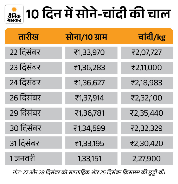 - Gold And Silver Prices Fall For Third Consecutive Day On January 1, 2026: Silver Drops ₹2,520 To ₹2,27,900 Kg, Gold At ₹1,33,151 10g
