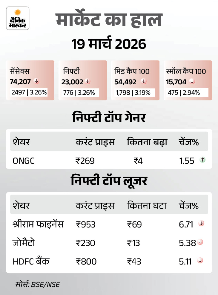 शेयर बाजार में 19 मार्च को 22 महीने की सबसे बड़ी गिरावट रही। सेंसेक्स 2497 अंक (3.26%) गिरकर 74,207 पर बंद हुआ। वहीं निफ्टी में भी 776 अंक (3.26%) की गिरावट रही, यह 23,002 पर आ गया है। बैंकिंग-ऑटो शेयर्स में आज सबसे ज्यादा बिकवाली रही। इससे पहले 4 जून 2024 को सेंसेक्स 5.74% गिरा था।
