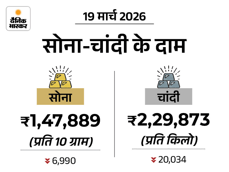 वहीं, 10 ग्राम 24 कैरेट सोना 7 हजार रुपए गिरकर 1.48 लाख रुपए पर आ गया है। इससे पहले 18 मार्च को सोना 1.55 लाख रुपए प्रति 10g था। अमेरिका-ईरान जंग के कारण सोना 5 कारोबारी दिन में 13 हजार और चांदी 38 हजार सस्ती हुई है।