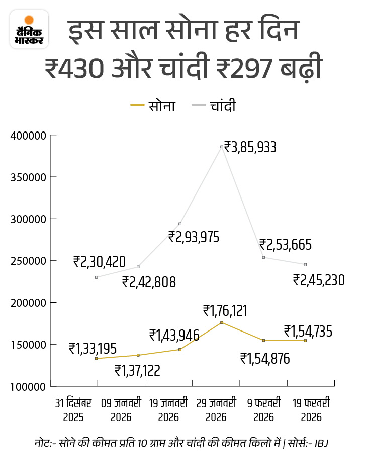 इस साल सोने-चांदी की कीमत में लगातार उतार-चढ़ाव देखने को मिल रहा है। सोना 2026 में अब तक 21,540 और चांदी 14,810 महंगी हो चुकी है। इस दौरान 29 जनवरी को सोने ने 1.76 लाख रुपए और चांदी ने 3.86 लाख रुपए का ऑल टाइम हाई भी बनाया था।