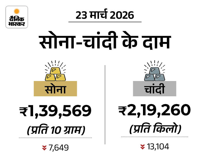 सोने-चांदी की कीमतों में 23 मार्च को गिरावट रही। इंडिया बुलियन एंड ज्वेलर्स एसोसिएशन (IBJA) के मुताबिक, 10 ग्राम 24 कैरेट सोना सुबह 12,077 रुपए घटकर 1.35 लाख रुपए पर खुला, लेकिन शाम को 7,649 रुपए की गिरावट के साथ 1.40 लाख रुपए पर बंद हुआ। इससे पहले इसकी कीमत 1.47 लाख थी।