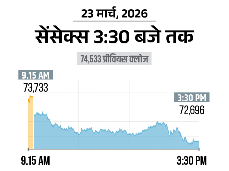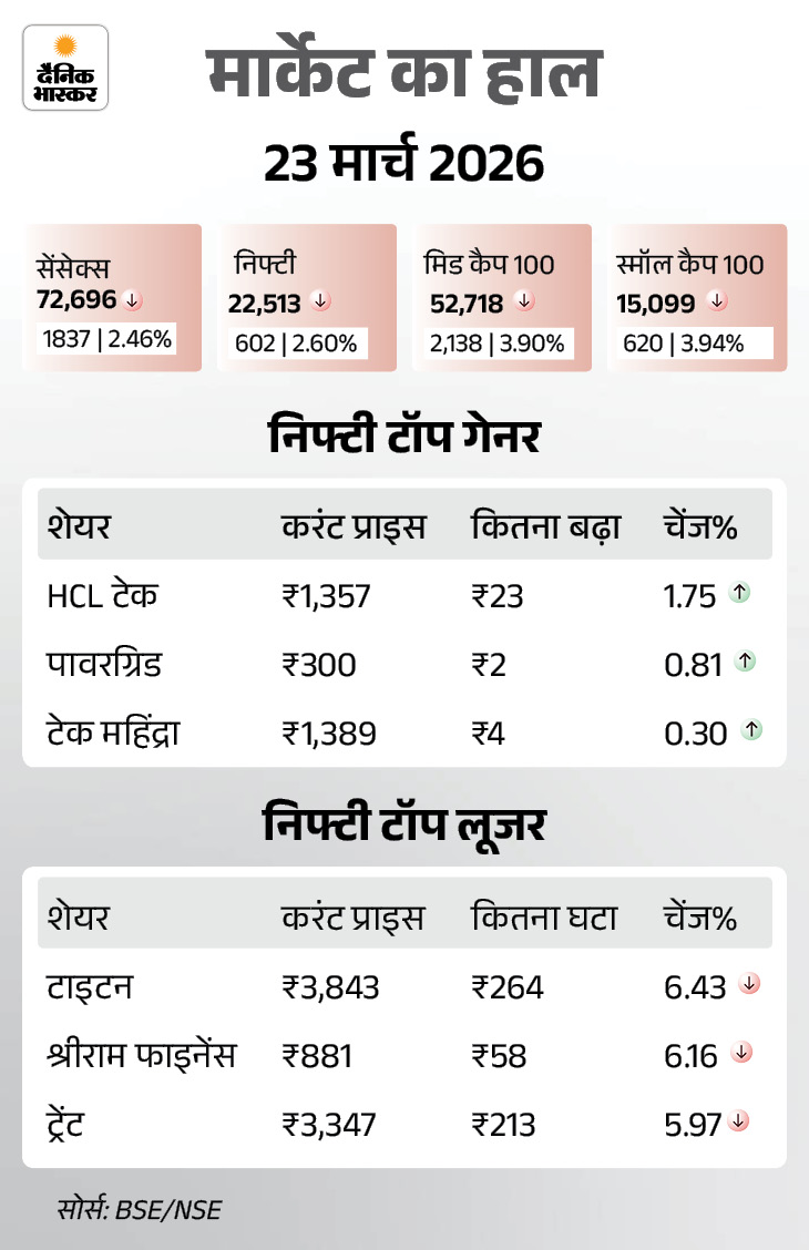 शेयर बाजार में सोमवार 23 मार्च को बड़ी गिरावट रही। सेंसेक्स 1837 अंक (2.46%) की गिरावट के साथ 72,696 पर बंद हुआ। वहीं निफ्टी में भी 602 अंक (2.60%) की गिरावट रही, ये 22,513 पर बंद हुआ। आज बैंकिंग, ऑटो, मेटल और FMCG शेयर्स में ज्यादा गिरावट रही।