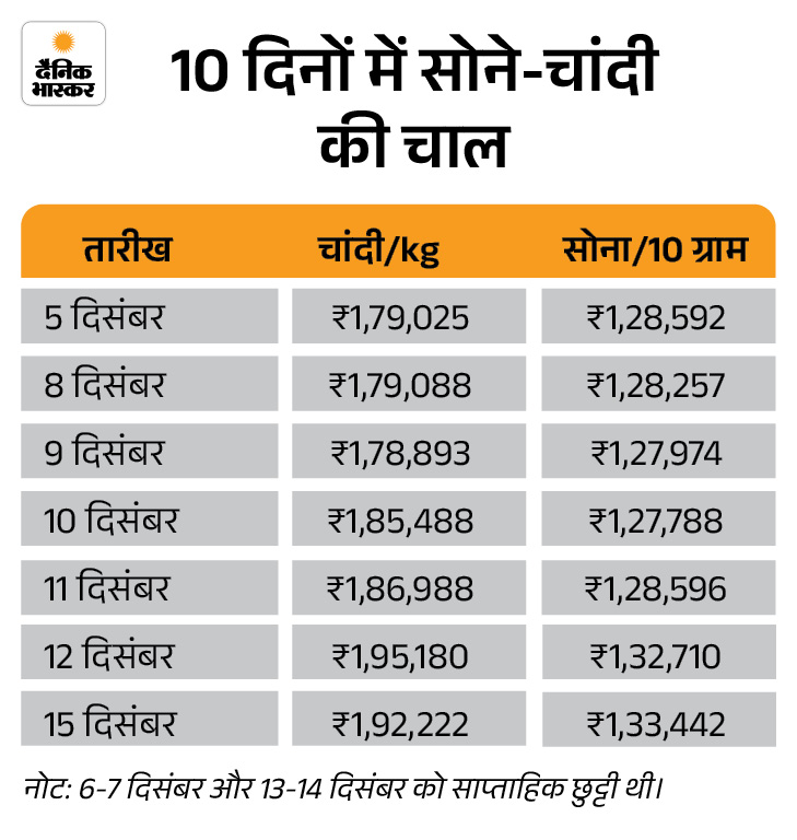 सोना ₹1.33 लाख के ऑलटाइम हाई पर: इस साल ₹57,280 महंगा हो चुका, चांदी आज ₹2,958 गिरकर ₹1.92 लाख किलो हुई