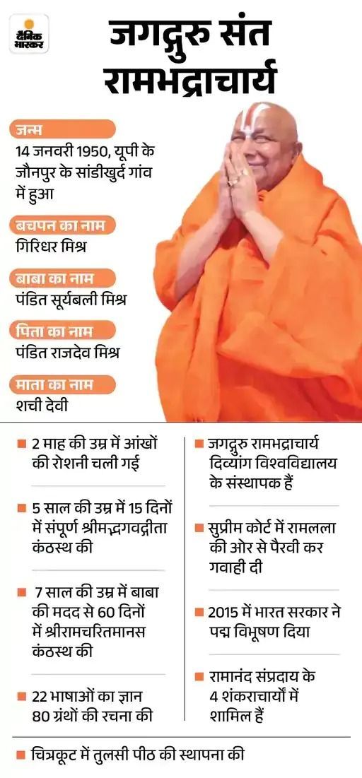 जन्म से दृष्टिबाधित रामभद्राचार्य, कठोर टिप्पणियों के लिए मशहूर जगद्गुरु रामभद्राचार्य एक संस्कृत विद्वान और हिंदू धर्मगुरु हैं। वे जन्म से ही दृष्टिबाधित हैं, फिर भी अपनी असाधारण विद्वत्ता के लिए जाने जाते हैं। उन्हें रामभक्ति परंपरा के प्रमुख आचार्य के रूप में माना जाता है। रामानंद संप्रदाय में उन्हें जगद्गुरु की उपाधि मिली है। उन्होंने संस्कृत, हिंदी और अवधी में कई रचनाएं की हैं। वे जगद्गुरु रामभद्राचार्य दिव्यांग विश्वविद्यालय, चित्रकूट का संचालन करते हैं। उन्हें 2015 में पद्म विभूषण से सम्मानित किया गया। वे ज्वलंत मुद्दों पर अपनी तीखी और कठोर टिप्पणियों के लिए जाने जाते हैं।