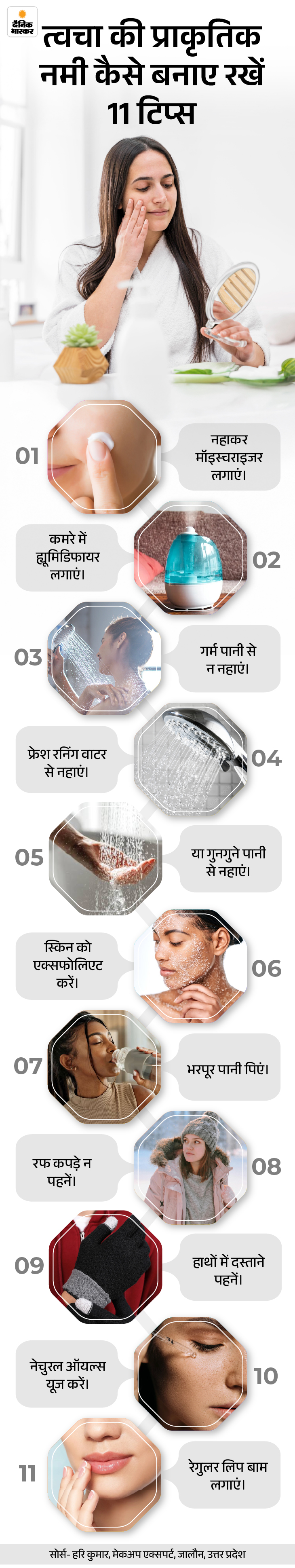 जवाब- सर्दियों में हवा की ठंडक और कमरे की ड्राईनेस त्वचा की नमी को तेजी से खींच लेती है। ऐसे में सिर्फ मॉइस्चराइजर ही नहीं, बल्कि कुछ सरल आदतें भी स्किन को मुलायम और हाइड्रेटेड रखने में बड़ा रोल निभाती हैं। नीचे ग्राफिक्स में देखिए।