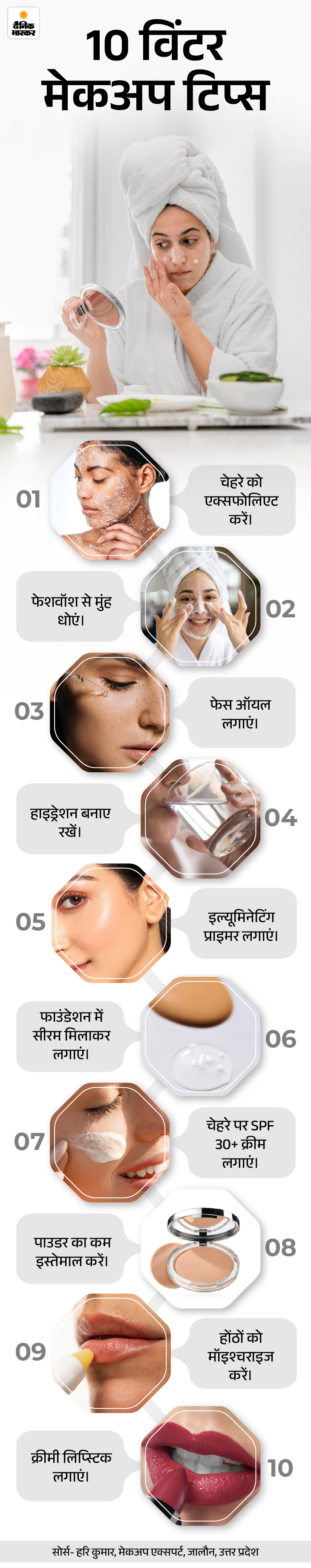 जवाब- विंटर मेकअप रूटीन में कुछ स्मार्ट बदलाव जरूरी हैं, जैसे हल्का एक्सफोलिएशन, फेस ऑयल, ड्यूई बेस, और हाइड्रेटिंग टेक्निक्स, जो पूरे दिन ग्लो और फ्रेशनेस बनाए रखें। पॉइंटर्स से समझते हैं-