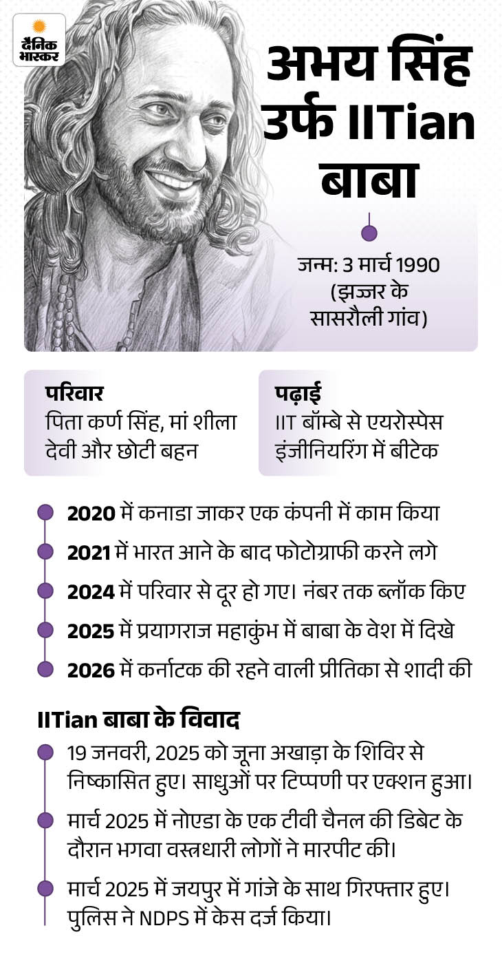 प्रयागराज महाकुंभ-2025 से चर्चा में आए IITian बाबा अभय सिंह ने शादी कर ली है। पत्नी का नाम प्रीतिका है। यह खुलासा खुद IITian बाबा ने सोमवार को किया। लंबे समय बाद वह भगवा कपड़े पहने हरियाणा के झज्जर पहुंचे। पत्नी प्रीतिका भी उनके साथ थीं। पढ़ें पूरी खबर…