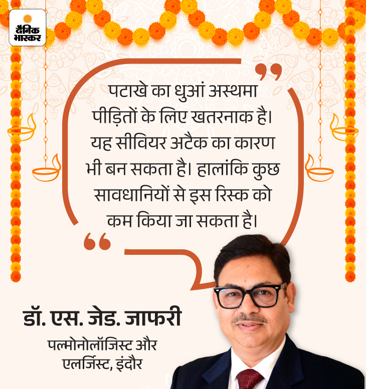 जवाब- पल्मोनोलॉजिस्ट डॉ. एस. जेड. जाफरी बताते हैं कि क्रॉनिक अस्थमेटिक लोगों के लिए दिवाली पर घर के बाहर निकलना खतरनाक हो सकता है। ज्यादा भीड़ और प्रदूषण वाले क्षेत्रों में जाने से अस्थमा ट्रिगर हो सकता है। इसलिए अगर बाहर जाना जरूरी हो तो मास्क पहनें और फेफड़ों को सुरक्षित रखने के लिए इनहेलर साथ रखें।