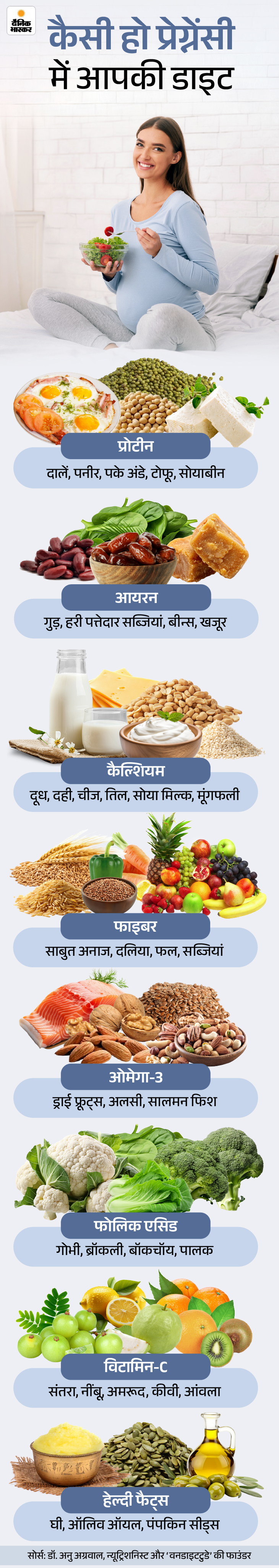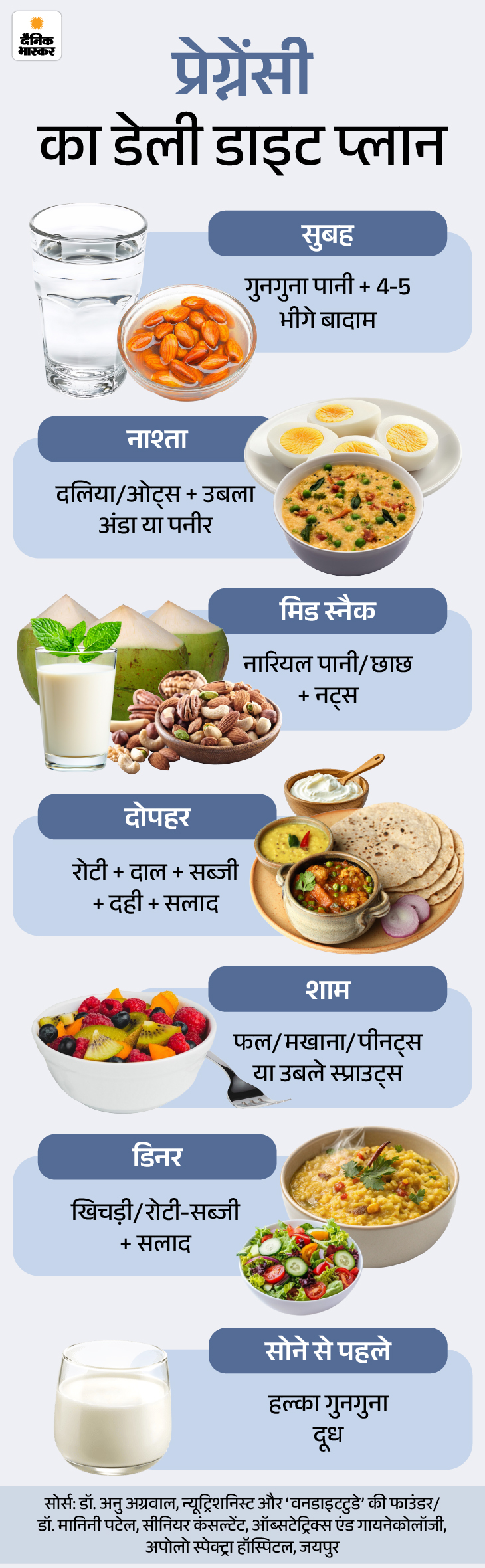 न्यूट्रिशनिस्ट डॉ. अनु अग्रवाल बताती हैं कि प्रेग्नेंसी में एक साथ ज्यादा खाने के बजाय थोड़ा-थोड़ा कई बार में खाना चाहिए। नीचे दिए ग्राफिक से प्रेग्नेंसी का सामान्य डेली डाइट प्लान समझिए-