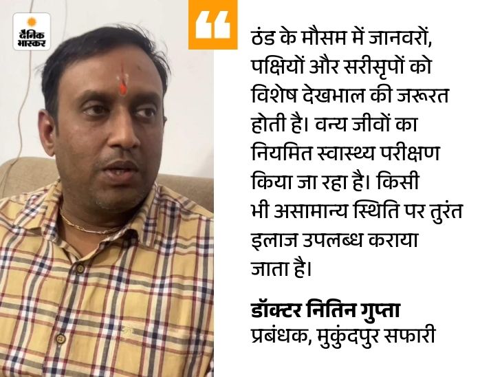 ठंड में खान-पान पर रहती है पैनी नजर मुकुंदपुर व्हाइट टाइगर सफारी में वन्यजीवों के प्रभारी चिकित्सक डॉ. नितिन गुप्ता के अनुसार, जानवरों के बाड़ों के सामने हीटर लगाए गए हैं, जबकि पक्षियों को गर्मी का अहसास कराने के लिए विशेष किस्म के बल्ब लगाए जा रहे हैं। उन्हें स्वस्थ और ऊर्जावान बनाए रखने के लिए विटामिन और पौष्टिक आहार दिया जा रहा है। बाघ, शेर और चीता के बाड़ों में छत से ओस और ठंडी हवाओं को रोकने के लिए ग्रीन शीट लगाई गई है।
