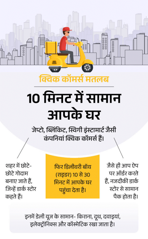 क्विक कॉमर्स यानी 10 से 30 मिनट के अंदर आपके घर तक सामान पहुंचाना। सामान्य ई-कॉमर्स जैसे- अमेजन और फ्लिपकार्ट में ऑर्डर करने के बाद 1-2 दिन या उससे ज्यादा लगता है, लेकिन क्विक कॉमर्स में बहुत तेज डिलीवरी होती है।