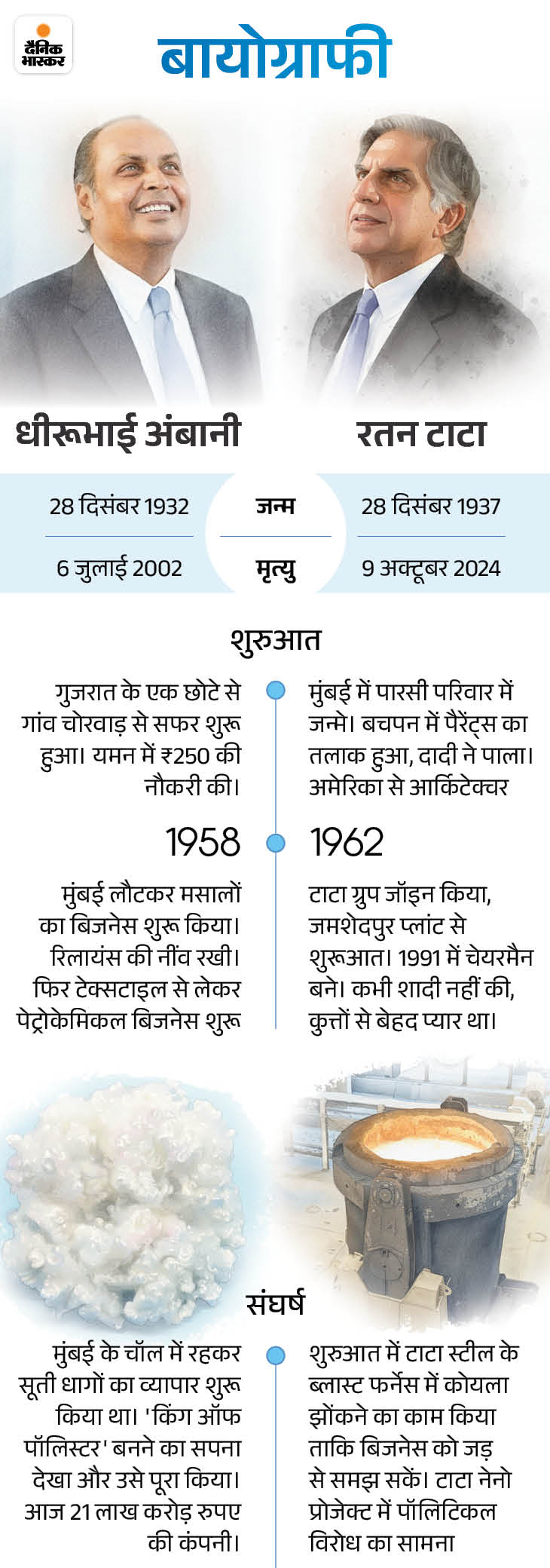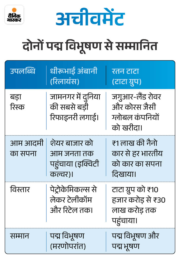 कॉर्पोरेट जगत के दो बड़े ‘टाइटन’, रतन टाटा और धीरूभाई अंबानी का जन्मदिन आज 28 दिसंबर को है। एक ने टाटा को ग्लोबल ब्रांड बनाया, दूसरे ने जीरो से रिलायंस की शुरुआत कर दुनिया को बताया कि ‘सोच बड़ी होनी चाहिए’। उनकी जिंदगी, सफलता और विरासत की ये ग्राफिकल स्टोरी पढ़िए…