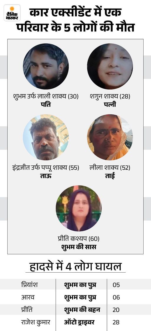 ठाटीपुर सरकारी मल्टी में रहने वाले ऑटो चालक राजेश कुमार से बात की तो उसने चलने के लिए हामी भर दी। दोपहर में शुभम उसकी पत्नी शगुन, सास प्रीति कश्यप, ताऊ इंद्रजीत तथा ताई लीला व शुभम के बच्चे प्रीति व प्रियांश ऑटो से दर्शन के लिए निकले। सबसे पहले ग्वालियर स्थित कैलादेवी मंदिर में दर्शन किए। वहां से वैष्णोधाम में दर्शन किए। रात को बर्थ-डे मनाने के बाद 10 बजे शीतला माता मंदिर के लिए सभी लोग रात में निकले थे, वहां से दर्शन करके वापस आते समय रात 2.49 बजे थाटीपुर में परशुराम चौराहा के ठीक पहले हादसे का शिकार हो गए।