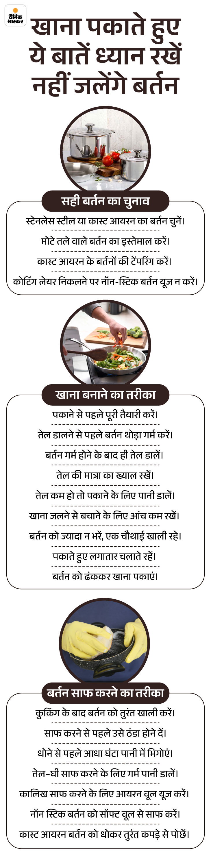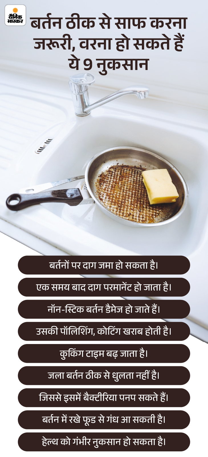 जवाब- जले हुए बर्तन या रसोई के अन्य बर्तन ठीक से नहीं साफ किए जाते हैं, तो हमारा स्वास्थ्य खराब हो सकता है और बर्तनों का नुकसान पहुंच सकता है। आइए इसे ग्राफिक के जरिए समझते हैं।