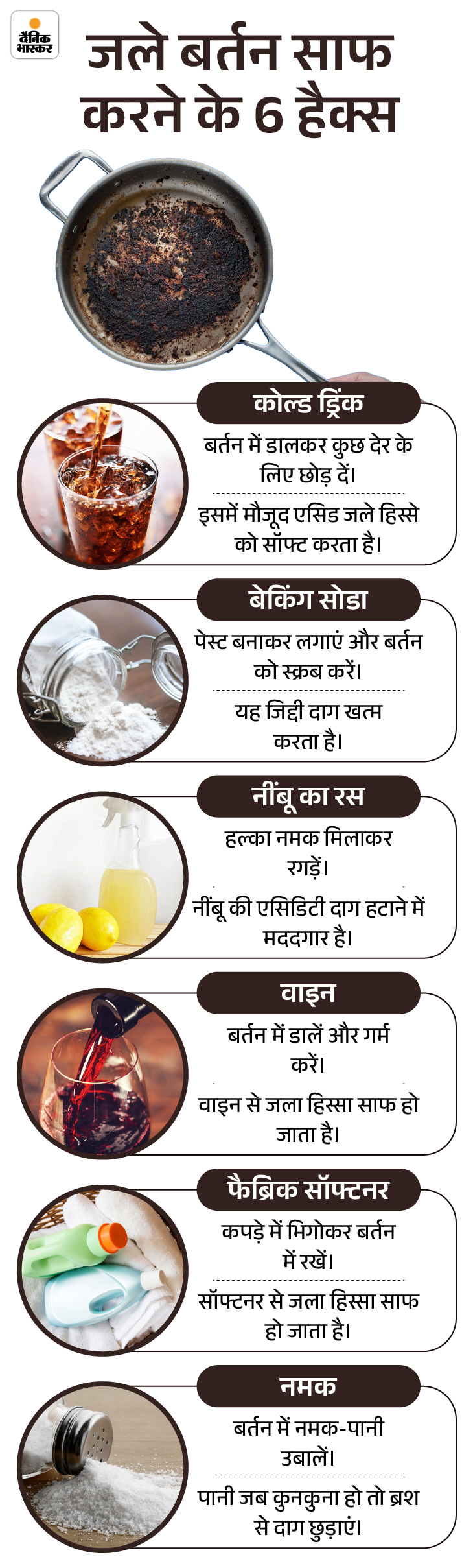जवाब- जले हुए बर्तनों को साफ करना किचन के सबसे मुश्किल कामों में से एक है। हालांकि आज हम जले हुए बर्तनों को साफ करने के 6 हैक्स के बारे में जानेंगे। आइए पहले इसे ग्राफिक के जरिए समझते हैं।