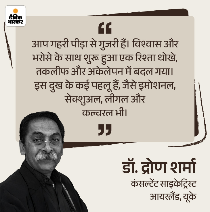 आप एक बहुत तकलीफदेह अनुभव से गुजर रही हैं। शादी का संबंध एक भरोसे और विश्वास के साथ शुरू होता है। इस रिश्ते में भरोसे की जगह आपको दुख, धोखा और अकेलापन मिला। इस दुख की कई परतें हैं। यह इमोशनल, सेक्शुअल पेन तो है ही, साथ ही इसकी कई सांस्कृतिक परतें भी हैं।