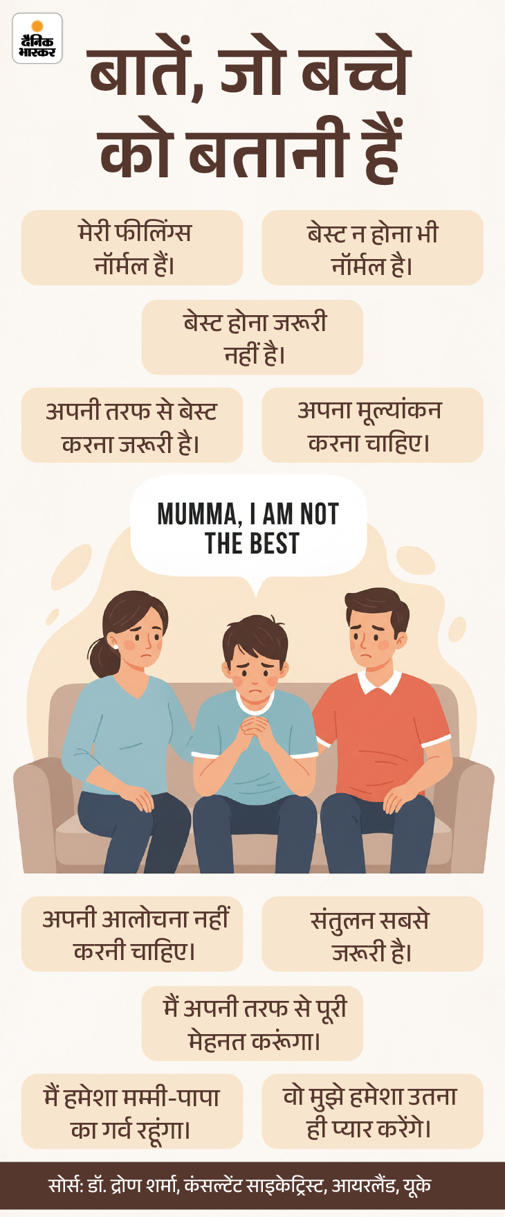 बच्चों की भावनाएं और व्यवहार कई बार माता–पिता, टीचर्स और आसपास के लोगों की अपेक्षाओं से भी तय होता है। बच्चों को लगता है कि टॉपर और बेस्ट होना ही उनके जीवन का सबसे बड़ा एसेट है। ऐसे में पेरेंट्स को सबसे पहले बच्चे को यह कॉन्फिडेंस देने की जरूरत है कि बेस्ट होने के लिए टॉपर होना जरूरी है। अपना बेस्ट वर्जन होना जरूरी है। इसके अलावा ये बेसिक बातें बच्चे को बतानी है–