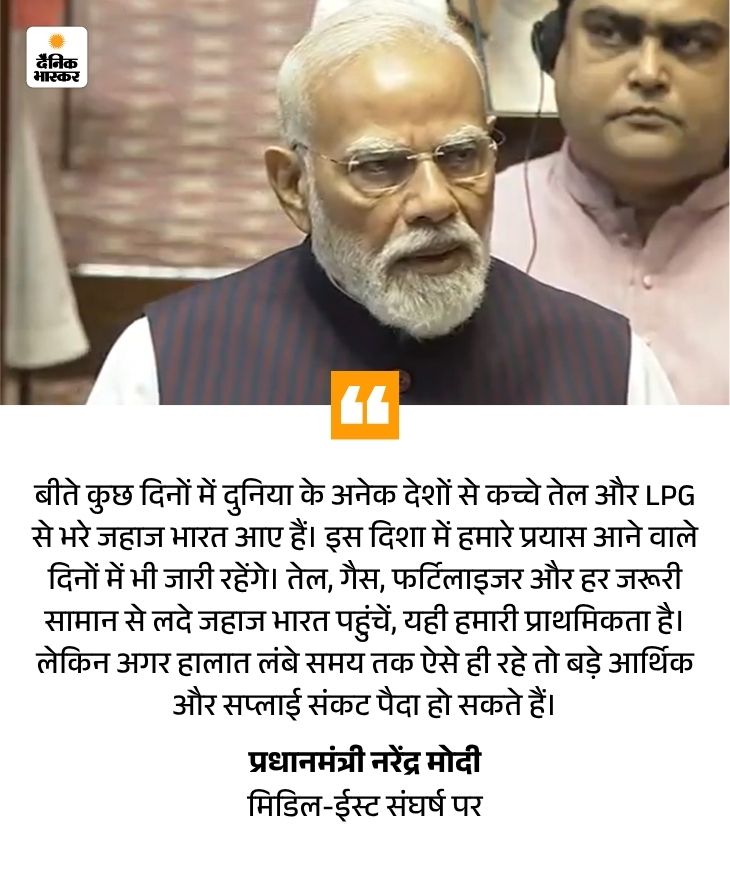 मोदी ने 24 मार्च को राज्यसभा में कहा था कि अमेरिका-इजराइल की ईरान से जंग जारी रही तो इसके दुष्परिणाम होंगे। आने वाला समय देश की सबसे बड़ी परीक्षा लेने वाला है। इसमें राज्यों का सहयोग जरूरी है। हमें टीम इंडिया की तरह काम करना होगा।