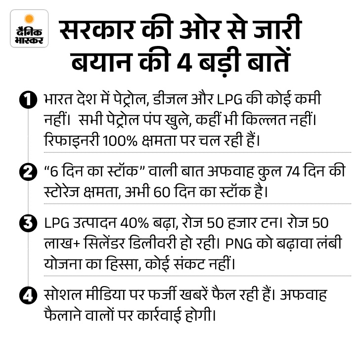 वहीं, सरकार ने देश में पेट्रोल, डीजल और LPG (रसोई गैस) की कमी की खबरों को पूरी तरह से खारिज कर दिया है। पेट्रोलियम और प्राकृतिक गैस मंत्रालय ने बयान जारी कर कहा कि दुनिया में कुछ भी हो जाए, भारत के पास 60 दिन का कच्चा तेल और ऑयल रिजर्व है।