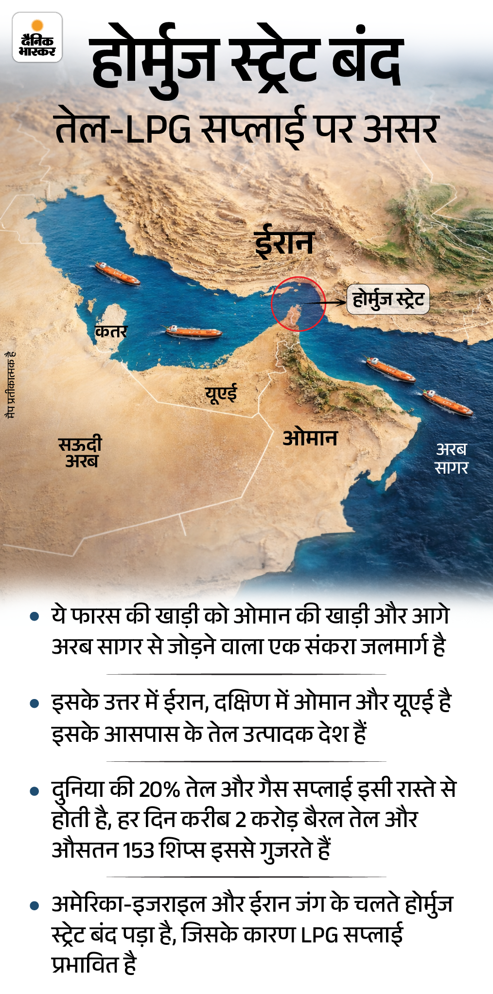 स्ट्रेट ऑफ होर्मुज करीब 167 किमी लंबा जलमार्ग है, जो फारस की खाड़ी को ओमान की खाड़ी और अरब सागर से जोड़ता है। दुनिया के कुल पेट्रोलियम का 20% हिस्सा यहीं से गुजरता है। ईरान जंग के कारण यह रूट अब सुरक्षित नहीं रहा है। खतरे को देखते हुए कोई भी तेल टैंकर वहां से नहीं गुजर रहा।