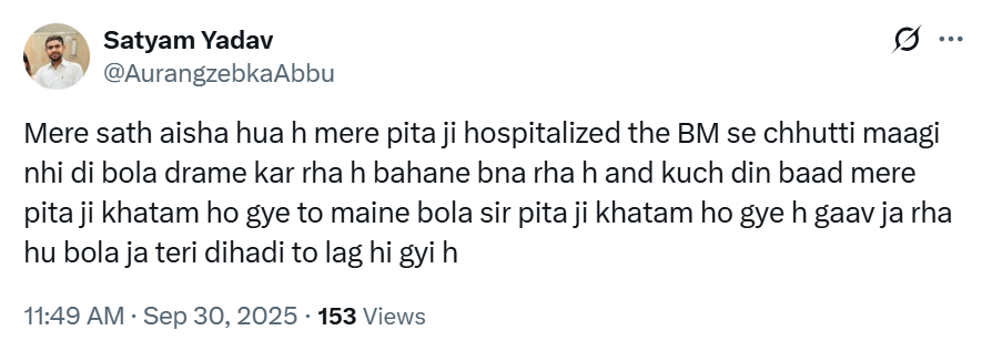 सत्यम यादव ने लिखा, ‘मेरे साथ ऐसा हुआ है, मेरे पिताजी अस्पताल में भर्ती थे। मैंने बीएम से छुट्टी मांगी, लेकिन उन्होंने नहीं दी। कहा कि मैं ड्रामा कर रहा हूं, बहाने बना रहा हूं। कुछ दिन बाद मेरे पिताजी का निधन हो गया। मैंने कहा, ‘सर, पिताजी का निधन हो गया है, मैं गांव जा रहा हूँ।’ उन्होंने कहा, ‘जा, तेरी दिहाड़ी तो लग ही गई है।’
