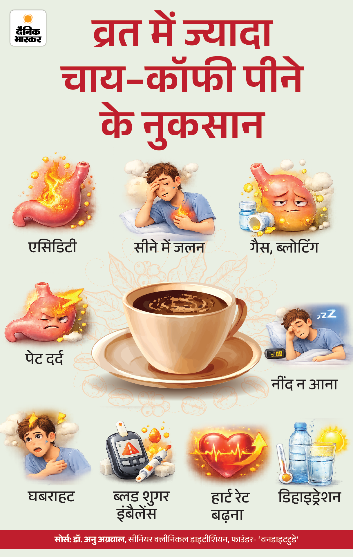 क्या करें- दिन भर में दो कप से ज्यादा चाय-कॉफी न पिएं। एकदम खाली पेट चाय-कॉफी न पिएं। कोशिश करें कि चाय-कॉफी में चीनी न हो।
